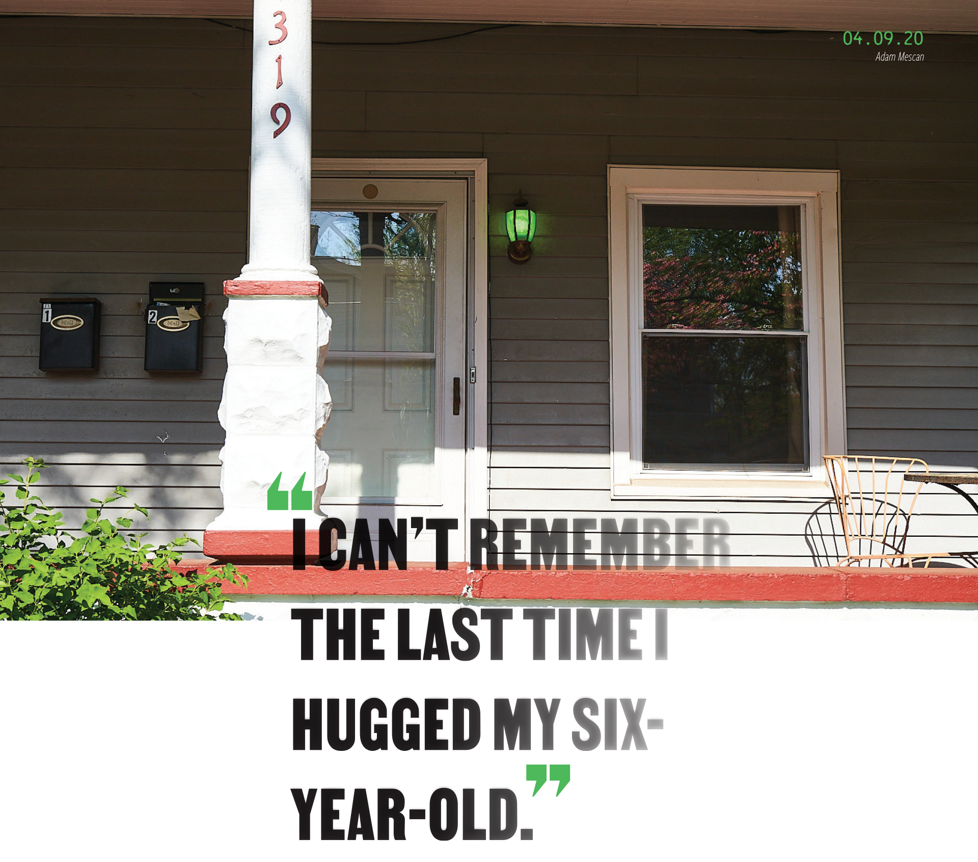“I went from talking to like 10, 15 people a day to only talking to my wife and two kids. It’s been weird. When I do get a phone call or a porch visit, I feel like I talk a lot because I’m so used to talking to people and have so much bottled up. Now I spend like 40 or 50 hours a week just me and the kids. Our daycare lady, I told her, ‘I already appreciated you before, but I appreciate you so much more now.’ My wife and I were talking about how the kids will always look back at this time like, ‘Oh, dad was around a lot.’ My wife works for Wicked Sheets, and they have a never-ending order for masks because they have the capacity to make them. Thousands and thousands of masks.
