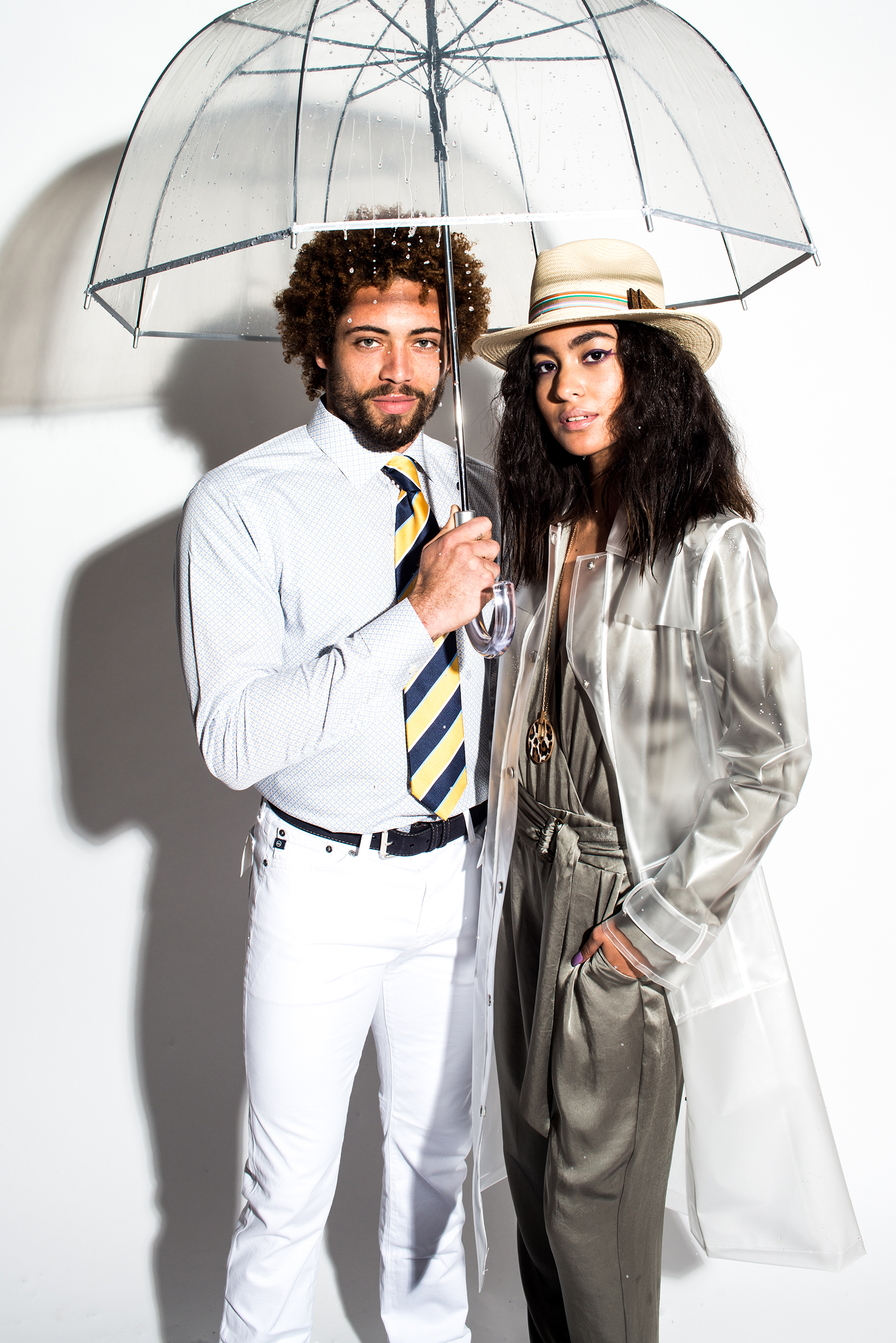 On Jasmine: The Hat Girls fascinator ($320) at the Hat Girls. Molly Bracken jumpsuit ($68) at Six Sisters. Deepa Gurnai necklace ($198) at Rodes for Her. Avec Les Filles raincoat ($130) at Von Maur.