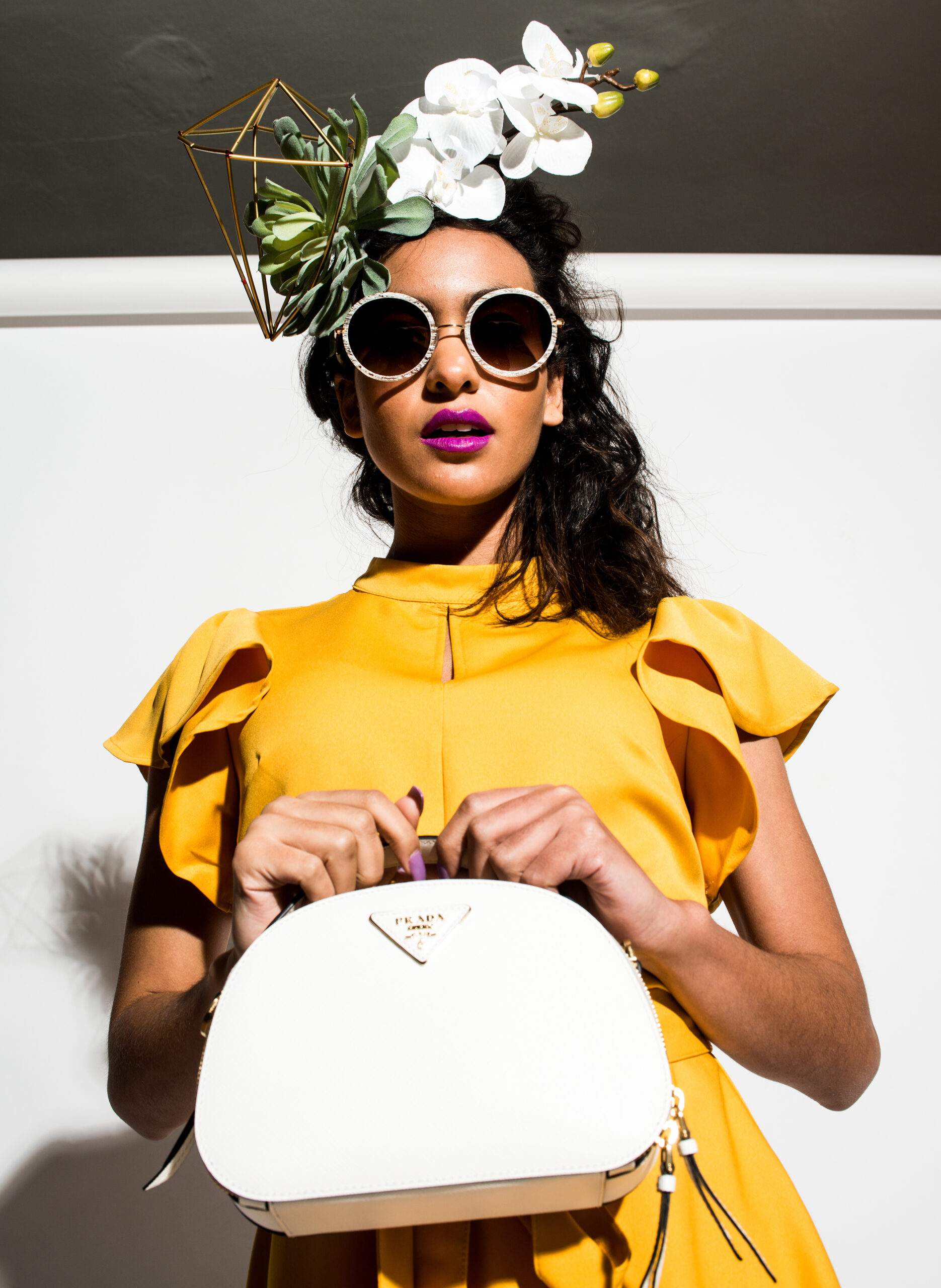 On Cheyenne: Tiffany Woodward fascinator ($150) at Six Sisters. TCEC dress ($55) at Apricot Lane. Prada bag ($1,950) at Rodes for Her. Crewe sunglasses ($255) at Rodes for Her.