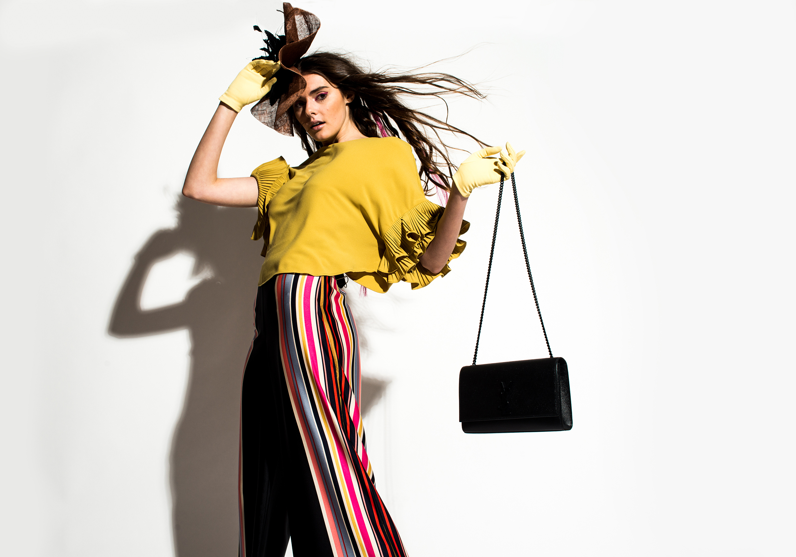 On Chloe: The Hat Girls fascinator ($375) at the Hat Girls. Gracia shirt ($86) and Trina Turk pant ($268) at Rodeo Drive. Yves Saint Laurent bag ($1,990) and Pedro Garcia shoes ($675) at Rodes for Her.