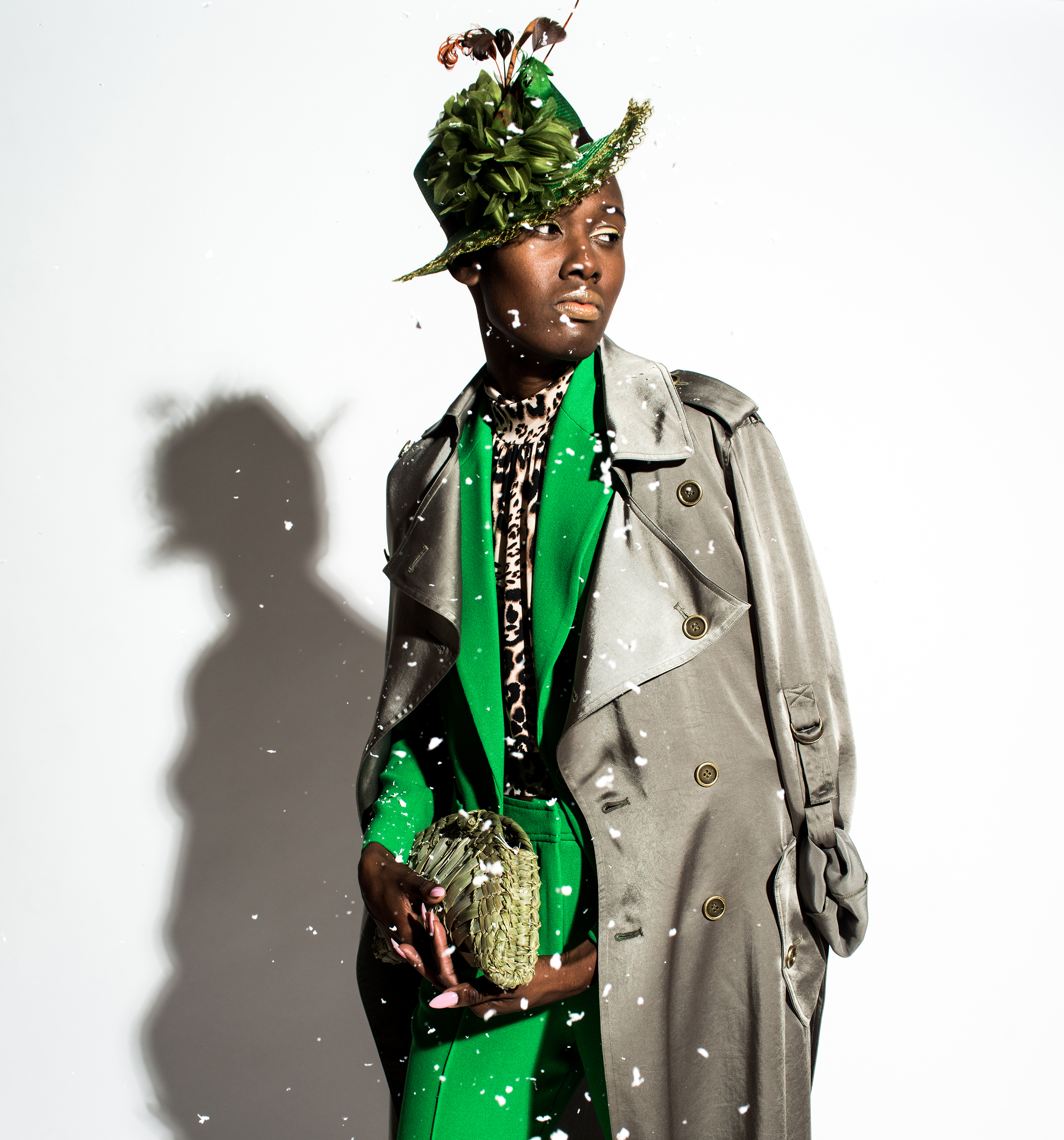 On Jasmine: Formé hat ($440) at Formé Millinery. Ramy Brook satin trench ($654), Trina Turk jacket ($468) and Trina Turk pants ($288) at Rodeo Drive. AFRM bodysuit ($58) at Von Maur. Alma clutch ($210) at Rodes for Her.