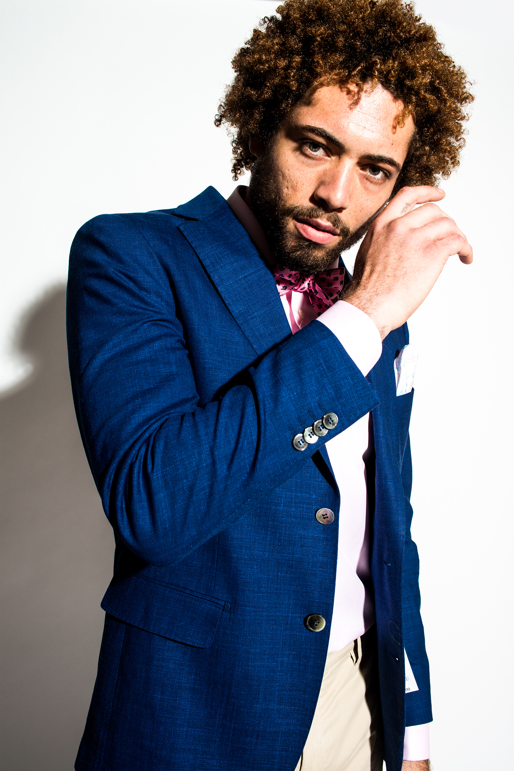 On Kris: Robert Jensen blazer ($895), Eton shirt ($255), Zanella pants ($225), Hanauer bow tie ($75) and Eton pocket square ($65) at Rodes for Him.