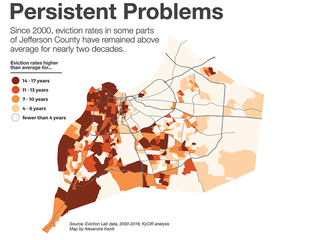 Legal Aid fields many requests for help but can’t tackle everything. In 2017, it assisted 1,340 adults and 1,030 children tied up in eviction proceedings. Most of the adult clients were female, 44 percent of them black and 20 percent of them single mothers. Every year for the last 10 years, between 16,300 and more than 17,600 evictions have been initiated in Jefferson County, according to court records. Of those, depending on the year, anywhere from 4,000 to more than 5,000 households wind up with an eviction judgment.