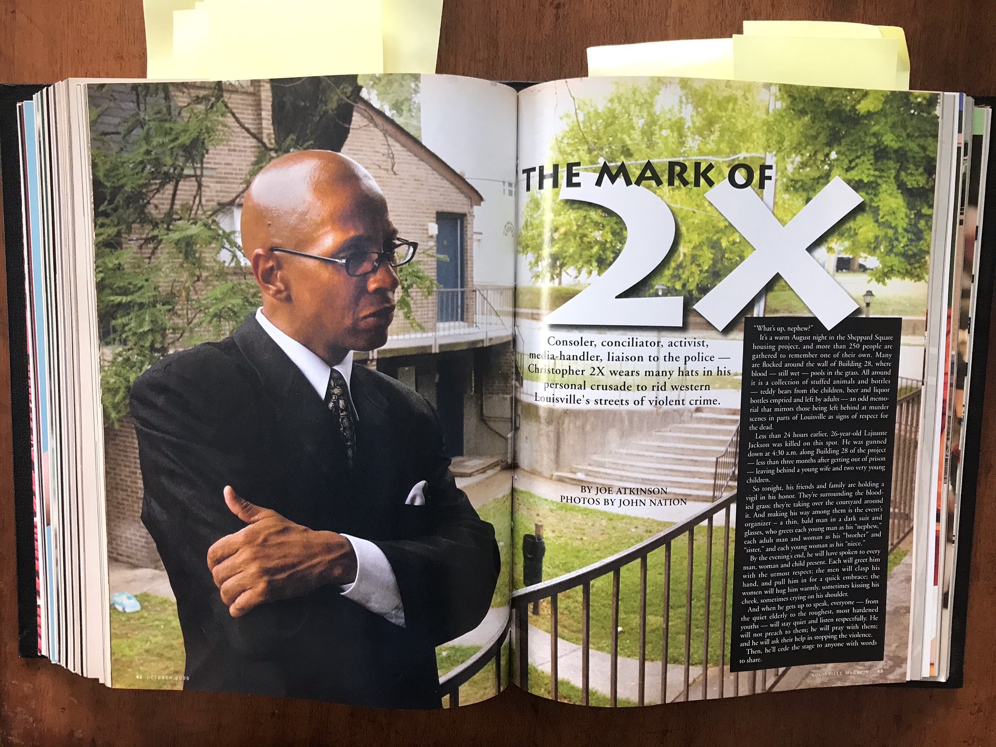 In 2005, Louisville Magazine published a profile of 2X, born Christopher Bryant in 1960. In the opening, Joe Atkinson wrote, “It’s a warm August night in the Sheppard Square housing project, and more than 250 people are gathered to remember one of their own. Many are flocked around Building 28, where blood — still wet — pools in the grass.