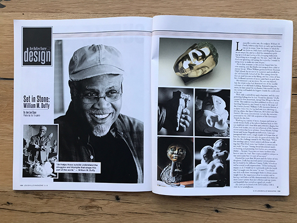 “Working in a variety of stone, bronzes and wood, Duffy…allows the viewer to see not only the grace of everyday life but also the challenges rooted in the West End. ‘When I’m creating a piece, I don’t consciously focus on telling that (West End) story, but I believe it comes out in my work,’ he says. ‘Strong, broad-shouldered mothers holding and protecting their babies are a recurring theme because I have seen so many mothers who have to carry the load. This is not a condition unique to our community, but it is part of our story.’”