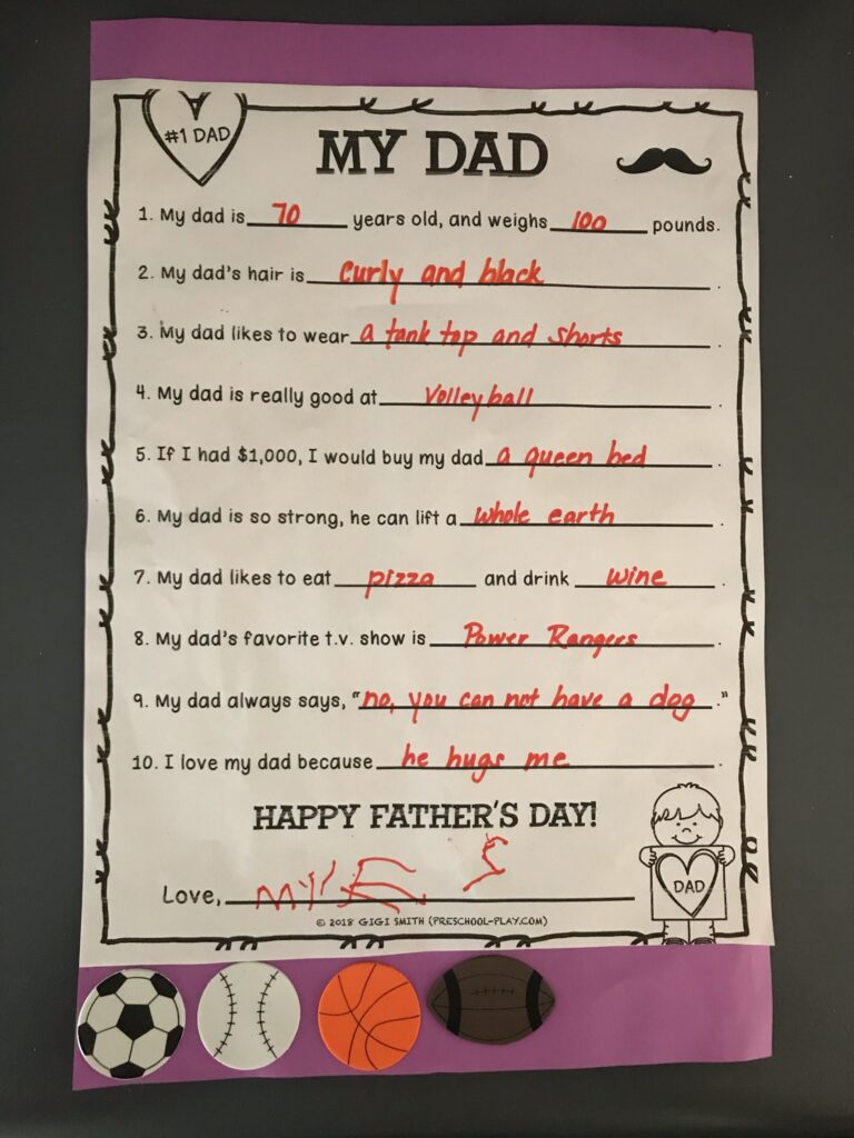 5. Dear reader: After more than a year together, it’s time for me to share a little more about myself, in the form of a fill-in-the-blank Father’s Day gift from Miles, my four-year-old. (Thank you to his preschool teachers, Miss Alisha and Miss Stacy, who wrote in the answers.)