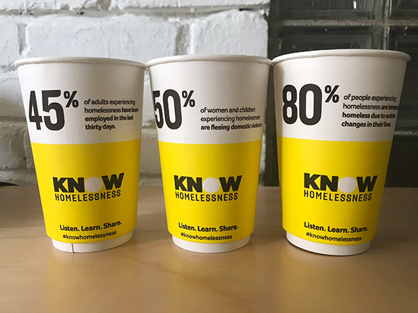 KERTIS Creative uses the Louisville Magazine office, and the other day hundreds of coffee cups showed up, part of the KNOW Homelessness campaign they’ve been working on with Access Ventures. Throughout August, coffee shops in Louisville and Southern Indiana — Heine Brothers’, Bean, Coffee Crossing, Full Stop Station, KentJava Bar, Mickey’s, Pearl Street Game & Coffee House, Quills and the Safai Coffee Bar inside Logan Street Market — will use the cups to educate the community about homelessness, with illuminating data such as: 80 percent of people experiencing homelessness are temporarily homeless due to sudden changes in their lives.