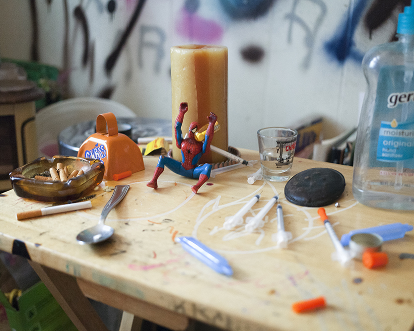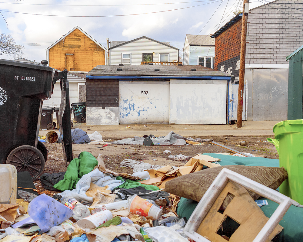 The dark basement could be the setting of a slasher flick. An old HVAC unit is a makeshift altar, holding a Virgin Mary statue surrounded by wrappers for the drug spice. Trash and pieces of old wood cover the ground, as does one of those ubiquitous piles of clothes and blankets you see under bridges. It’s the kind of thing you pass every day in Louisville, but here in the dark basement, it feels personal. Someone was squatting here, in a space so cluttered with debris it’s hard to find the floor. Living doesn’t get much rougher.