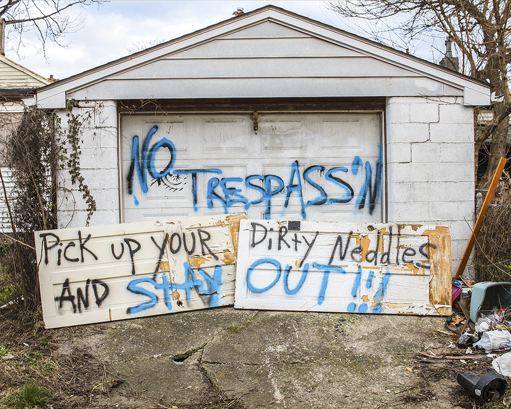 But then the pseudonymous photographer Vyncex found the building. He put a new lock on the front door and barricaded access points like he was prepping for a zombie apocalypse: planks of wood secured across windows, other boards nailed to the ground and leaned against doors. The signs warning of cameras and security systems are bluffs. Vyncex has alerted police to a squatter in the basement, and, other than more needles appearing in the sheltered outdoor stairs leading to that basement, the building has been secured. It might survive another winter. “I was just walking through the alleys one day taking photos and hanging out, and I saw a guy and his girlfriend passed out…on the back stairs,” he says. “So I was like, ‘Yo, y’all got to get the fuck out of here, man; my uncle owns this building.’”