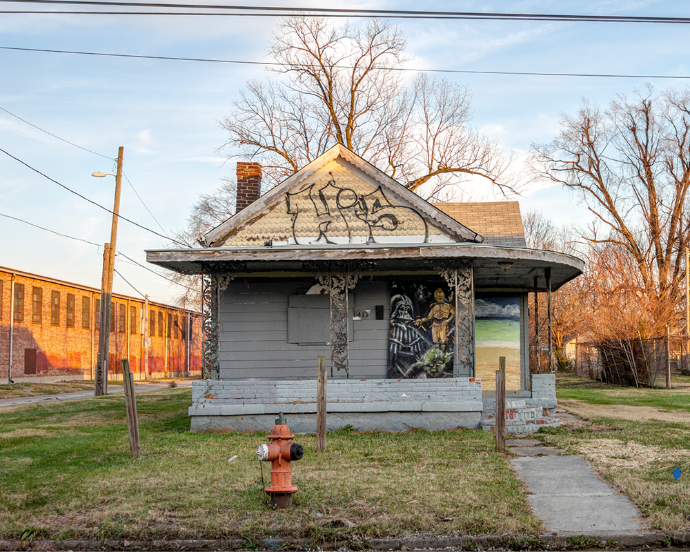His uncle does not own the building. Neighbors say it was being renovated, but construction ceased a few years ago, and the house has since sat stagnant. When Vyncex noticed a door had been kicked in on the grand structure, he saw an opportunity to get inside and take photos — an activity he does in abandoned buildings, or “bandos,” all over Louisville. He thought he’d just be back a few times to shoot, but then he got to thinking: What if he could save the old building and make it into something other than a trap house waiting to burn down? “There are more of these; they’re just sealed up and shit. If they aren’t sealed up, I’ll go seal them up,” he says. “I just don’t want people shooting up dope in them, man.”